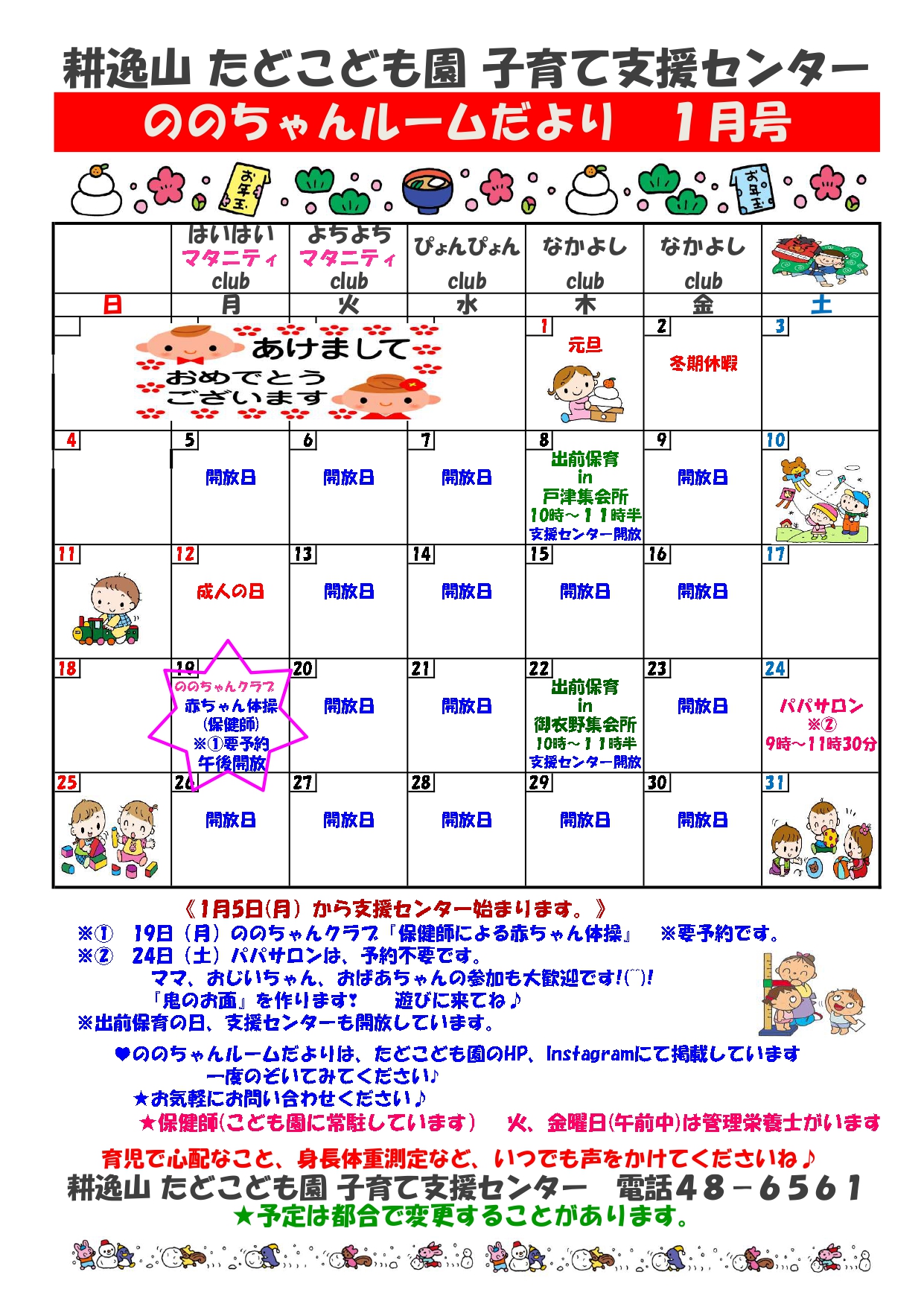 | 9:00〜11:30 | はいはいClub(0~8ケ月)マタニティClub(妊娠5か月~)親子遊び・手遊びなど |