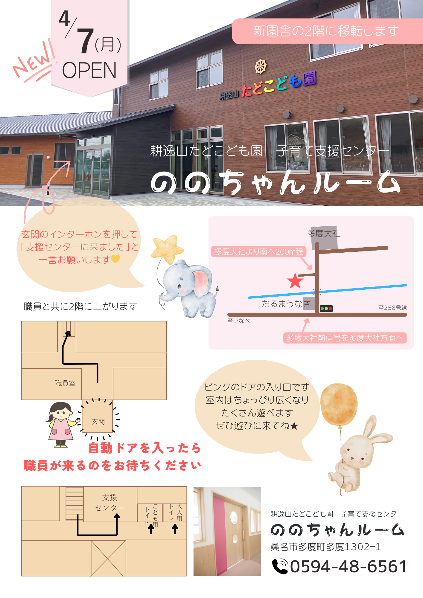 お越しの際はこども園の玄関のインターホンを鳴らし、「支援センターに来ました」とお伝えください。