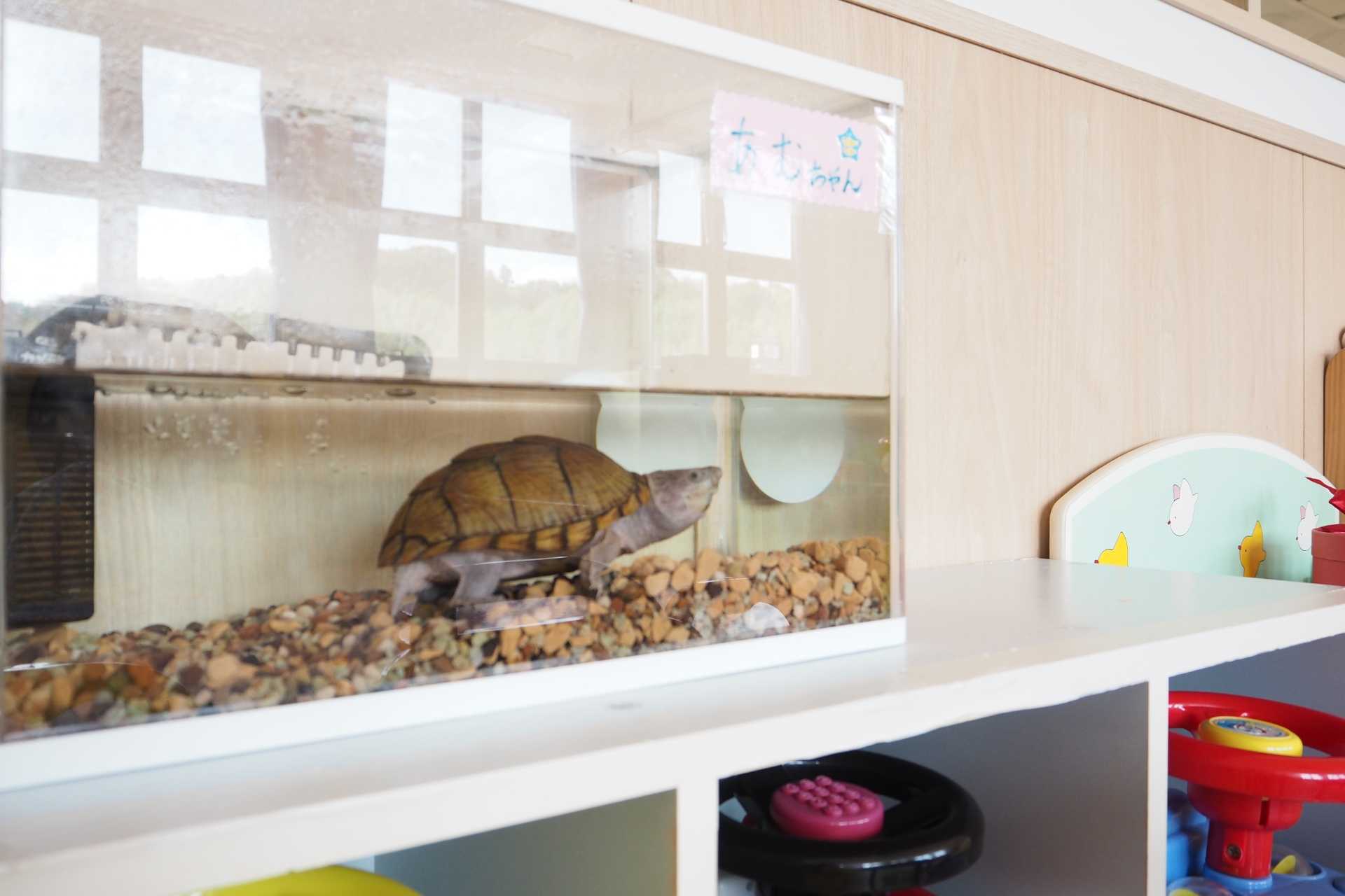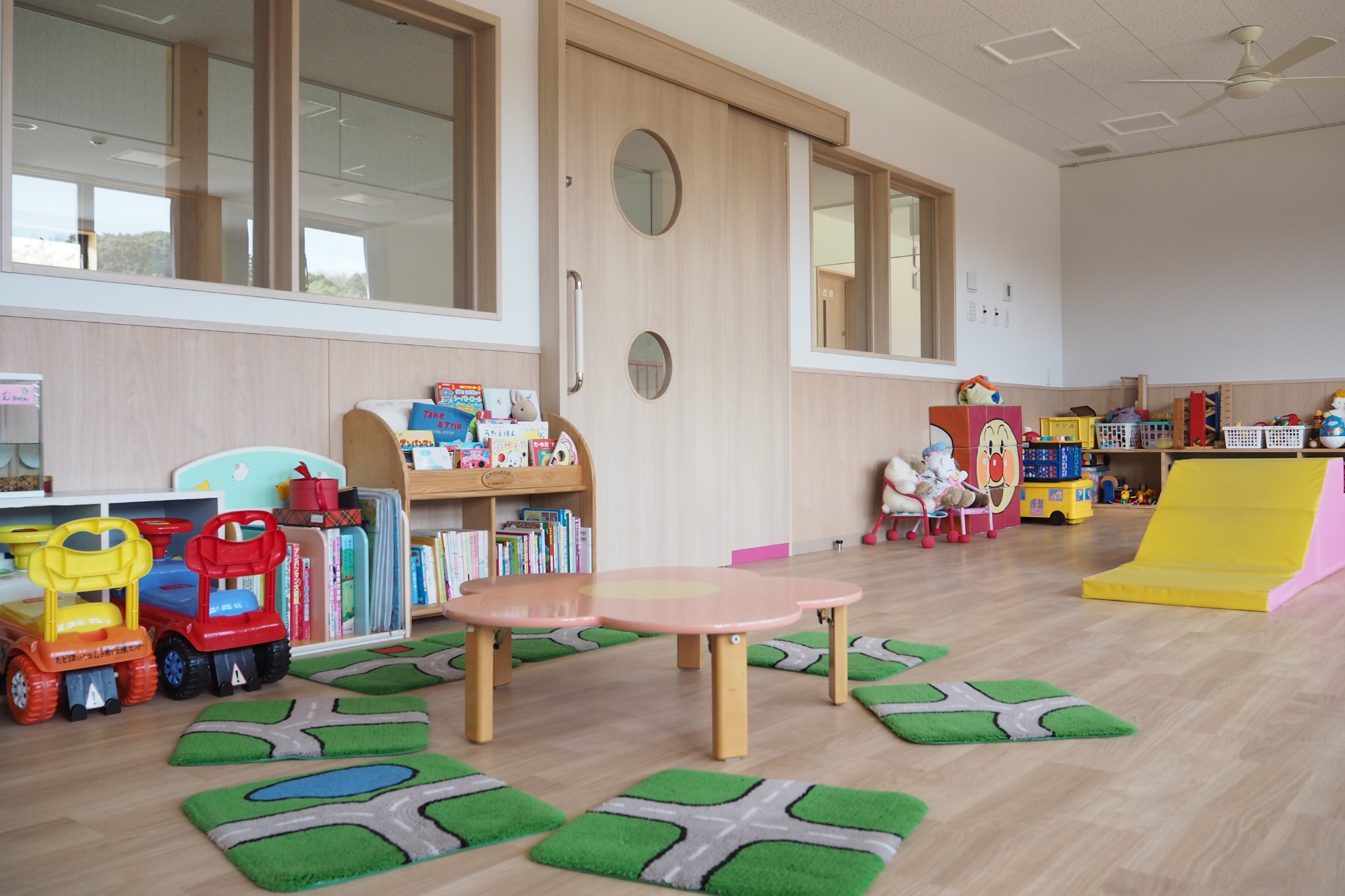 支援センターは2階です。低めの階段で小さなお子様でも昇り降りしやすいよう工夫しております。